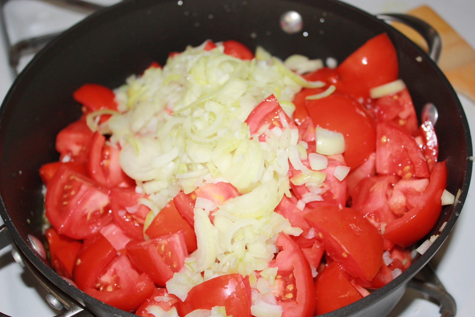 Add the tomatoes, onions, salt, and pepper to the skillet.  Cook for about 15-20 minutes, stirring frequently.  The tomatoes will begin to break down.  As that happens begin using a fork or a potato masher to break the tomatoes apart.  Keep cooking for about another 5 minutes until the tomatoes are completely mashed and mixed in.